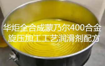 华炬新产品研究所技术咨询委员会科研人员现推荐一项一种全合成蒙乃尔400合金旋压加工工艺润滑剂配方,该技术的显著优点:该技术的组合物具有良好的高温润滑性、极压抗磨承载能力、渗透性、扩散性、清洗性、防锈性,现将该一种全合成蒙乃尔400合金旋压加工工艺润滑剂配方及技术方案实施例介绍如下供研究交流参考:(611511 226395)
