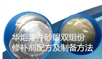 华炬科技新产品研究所技术咨询委员会科研人员现推荐一项一种零件砂眼双组份修补剂配方及制备方法,该技术具有以下有益效果:该技术所制备的砂眼修补剂耐最高温度较高,达到168~185℃,摩擦损耗率较低,显示良好的耐磨性。测试结果表明,组分中的氮化硼、马来酸酐接枝聚乙烯和甘油三醋酸酯在提高修补剂的耐热和耐磨性发挥显著的作用,现将该一种零件砂眼双组份修补剂配方及制备方法及技术方案及实施例介绍如下供研究交流参考:(841121 551572)