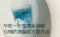 较强的溶解性:此种防溅膜遇水后迅速溶胀,并且溶解,最终会完全溶于水,不会对马桶造成堵塞,溶解后其中含清新香味的香精散发到卫生间里面,让卫生间时刻保持空气清新;环保性:该防溅膜采用的均为环保型原料,对于环境和人体无伤害,使用和携带方便:使用时只需将防溅膜平铺放在马桶水面之上,一次性使用;体积小也便于携带,且该防溅膜生产成本较低,现将该一次性完全溶解马桶防溅膜配方及方法及技术方案及实施例介绍如下供研究交流参考:(571241 261809)